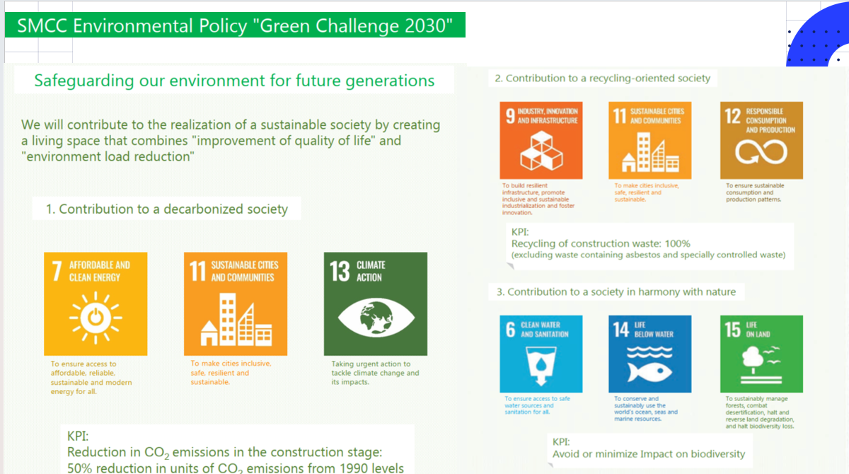We, as a general construction company that connects people and communities, contribute to the realization of a sustainable society by improving the quality of life and reducing environmental impact.